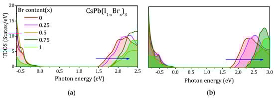 Calculated total density of states (TDOS) of CsPb(I1−xBrx)3 with various doping concentrations by (a) PBE-GGA and (b) mBJ-GGA potentials where the valence band maximum (VBM) is shifted to 0 eV.