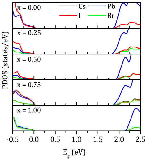 Calculated partial density of states (PDOS) of CsPb(I1−xBrx)3 using the mBJ-GGA potential.