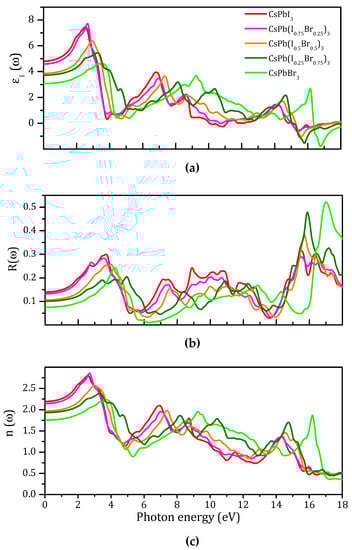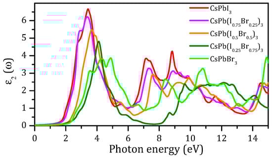The incident photon interacts with the constituent atoms, and subsequently, the dielectric function ε(ω) describes the optical response of a material. In Figure 7, the imaginary parts ε2(ω) of the calculated dielectric functions are shown using the results of the mBJ-GGA method. The optical parameters, including refraction, reflection, and absorption, can be derived from the real and imaginary parts of the dielectric function [9,69]. The complete response of a material to the disturbances caused by electromagnetic radiation is described by the complex dielectric function [57]. The imaginary part of the function ε2(ω) is related to the band structure and describes its absorptive behavior [57]. The critical (start) points in the spectra of ε2(ω) were at 1.79, 1.945, 2.11, 2.26, and 2.33 eV for CsPbI3, CsPb(I0.75Br0.25)3, CsPb(I0.5Br0.5)3, CsPb(I0.25Br0.75)3, and CsPbBr3, respectively, which are closely related to the band gaps of 1.78, 1.89, 2.21, 2.23, and 2.34 eV, respectively.