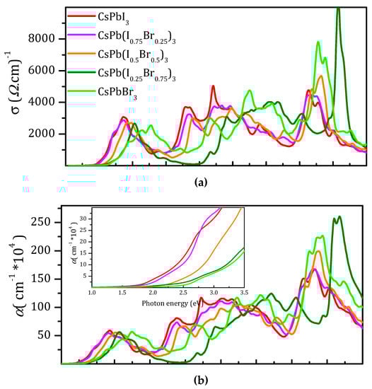 Calculated optical conductivity σ(ω) (a), absorption coefficient α(ω) (inset: absorption spectra in the range from 1.0 to 3.5 eV) (b), and extinction coefficient k(ω) (c) as functions of photon energy for CsPbI3, CsPb(I0.75Br0.25)3, CsPb(I0.5Br0.5)3, CsPb(I0.25Br0.75)3, and CsPbBr3.