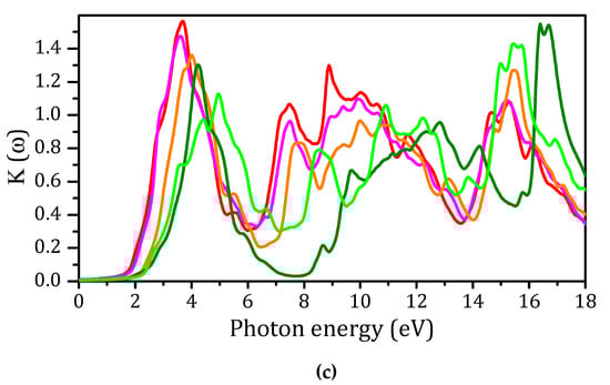 The optical conductivity spectra, σ(ω), shown in Figure 8a, demonstrate that optical conductance started at approximately 1.728, 1.864, 2.13, 2.48, and 2.54 eV for x = 0.00, 0.25, 0.50, 0.75, and 1.00, respectively; the σ(ω) values reached their maxima and then decreased with small variations [57,70]. Similar features were also observed for the absorption coefficients α(ω) (Figure 8b) and extinction coefficients k(ω) (Figure 8c). The wide absorption range suggests that these compounds could be used for various optical and optoelectronic devices in this range of the EM spectrum. Moreover, the absorption range could be tuned by varying the composition fraction with values for x between 0.00 and 1.00.