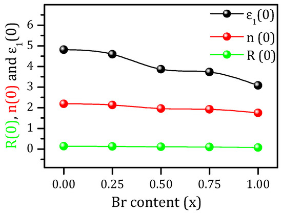 Zero frequency limit of ε1(0), n(0), and R(0) vs. Br content (x).