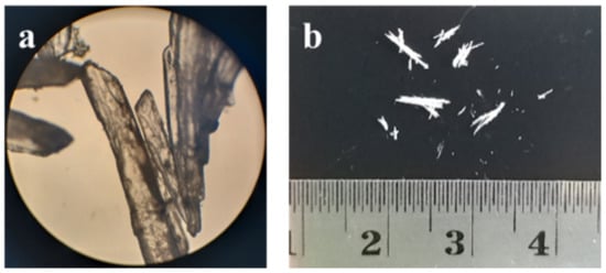 Morphological observation of ciprofloxacin salicylate crystals (a) under a microscope with 10x magnification and (b) without a visualizing aid.