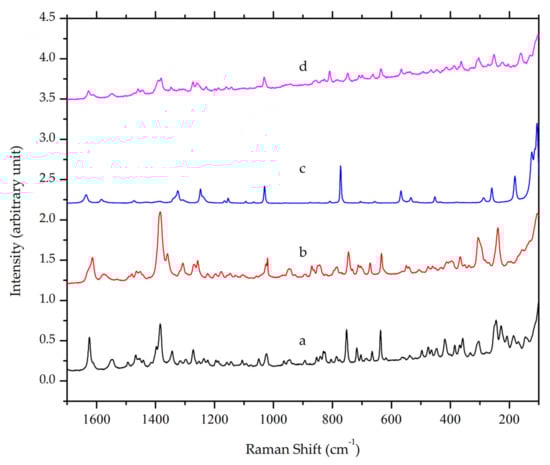 Overlaid Raman spectra of (a) ciprofloxacin HCl, (b) ciprofloxacin base, (c) salicylic acid and (d) ciprofloxacin salicylate multicomponent crystal.