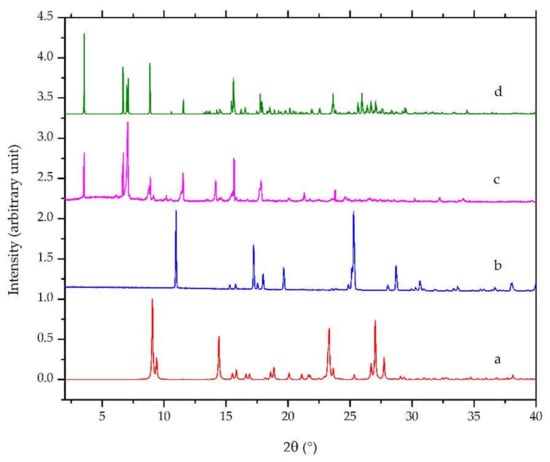 Powder X-ray diffractograms of: (a) calculated ciprofloxacin base [], (b) calculated salicylic acid [], (c) measured ciprofloxacin salicylate • 1.75 H2O, and (d) calculated ciprofloxacin salicylate • 1.75 H2O (this work).