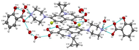 The molecular drawing of ciprofloxacin salicylate • 1.75 H2O with 30% probability thermal ellipsoids. Blue broken lines show the hydrogen bonds.