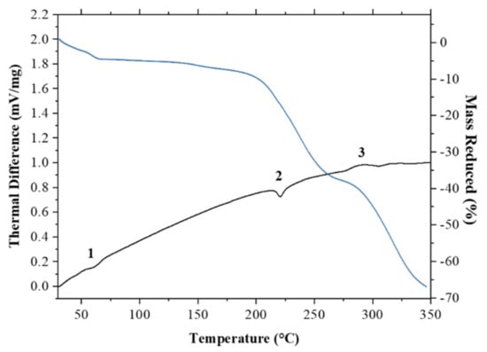 The samples were placed in an aluminum pan and then heated at a temperature range between 30 °C and 350 °C with a heating rate of 10 °C/min. An empty aluminum pan was used as a reference. All of the pans were closed during the analysis.