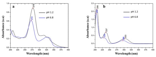 UV spectra of (a) ciprofloxacin and (b) salicylic acid in pH 1.2 and pH 6.8 media.