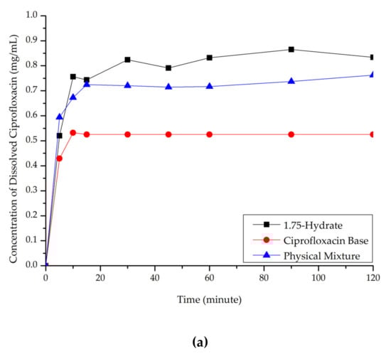 Ciprofloxacin salicylate 1.75 hydrate salt dissolved more rapidly and reached a higher concentration at a steady-state in pH 1.2 when compared to ciprofloxacin and the physical mixture, as shown in Figure 10a. At pH 6.8 (Figure 10b), although the salt exhibited a higher concentration in the early observation period, the amount of dissolved ciprofloxacin then decreased. This phenomenon was caused by the transformation of ciprofloxacin from the 1.75 salt hydrate to its base form, which is less soluble than the multicomponent crystal []. Eventually, the steady-state was reached. The concentration of ciprofloxacin at a steady-state is similar to that of ciprofloxacin alone, physical mixture, and salt. To confirm this phenomenon, PXRD was used to analyze the undissolved material in pH 1.2 media. The result is attached in Supplementary Material 2, which shows the diffractogram consisting of the peaks of starting materials (ciprofloxacin monohydrate and salicylic acid) and the 1.75 salt hydrate. It means that the bond between the two components broke up in this dissolution media and showed the parachute effect, which showed decreasing dissolution after a maximum peak [].