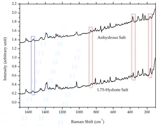 Comparison of Raman spectra between ciprofloxacin salicylate • 1.75 H2O and anhydrous ciprofloxacin salicylate, red and blue boxes mark red and blue shifts in the spectra, respectively.