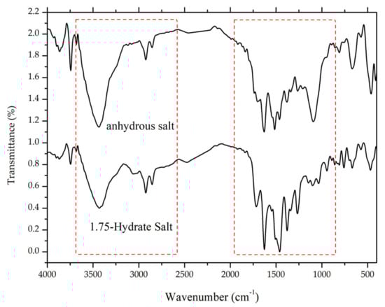 Comparison of FTIR spectra between ciprofloxacin salicylate • 1.75 H2O and anhydrous ciprofloxacin salicylate, red boxes marks -O-H stretching region.