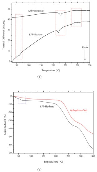 Comparison of thermogram between ciprofloxacin salicylate • 1.75 H2O and anhydrous ciprofloxacin salicylate using (a) DTA and (b) TG, blue boxes indicate the region where changes occur.
