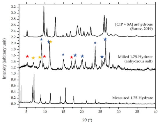 Comparison of powder diffractograms between ciprofloxacin salicylate • 1.75 H2O, the milled sample, and Surov’s anhydrous phase []. The red marks indicate Surov’s anhydrous peaks; yellow ones are the peaks of origin ciprofloxacin salicylate • 1.75 H2O, and the blue ones represent the peaks of a new anhydrous phase yielded after milling.