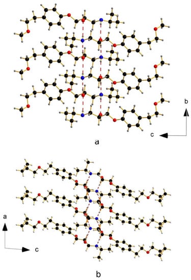 As highlighted in Figure 1, in both metoprolol and betaxolol I crystal structures, infinite columns of API molecules extending along one axis direction (b and a, respectively) connected by two pair of intermolecular hydrogen bonds are present. The hydroxyl and amine groups act both as hydrogen-bond donors and acceptors, giving rise to a (10) hydrogen-bond pattern [10].