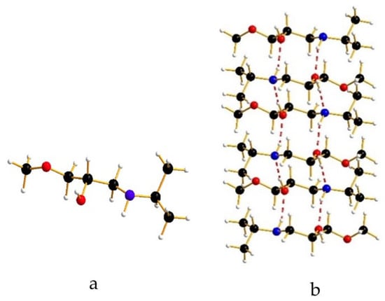 In order to verify this behavior, a computational experiment was realized. We built a simplified model of our structures, namely the 1-(isopropylamino)-3-methoxy-2-propanol, 1, as shown in Figure 4a, where the skeleton of the compounds is maintained, while the phenyl moiety is substituted with a methyl group. We arranged 1 in the same mono-dimensional hydrogen bond column (see Figure 4b), and we fully optimized the structure.