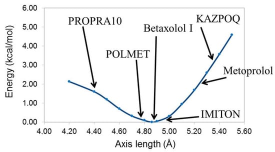 A close look at Table 1 and Figure 3 shows anisotropic thermal expansions for all considered crystals except for betaxolol and in part for POLMET. Only for PROPRA10, the largest change in the axes is correlated with the hydrogen bond column. In Figure 3 and in Table 1, the axis parallel to the hydrogen bond columns is highlighted with a broader line and a bold entry, respectively. In any case, a trend for the axis of the hydrogen bond column can be identified. If the axis is greater than 5 Å, as for metoprolol and KAZPOQ, a shrinkage was calculated. In the other crystals, an increase was observed instead.