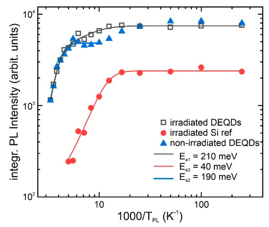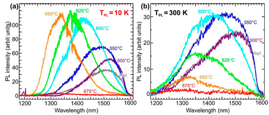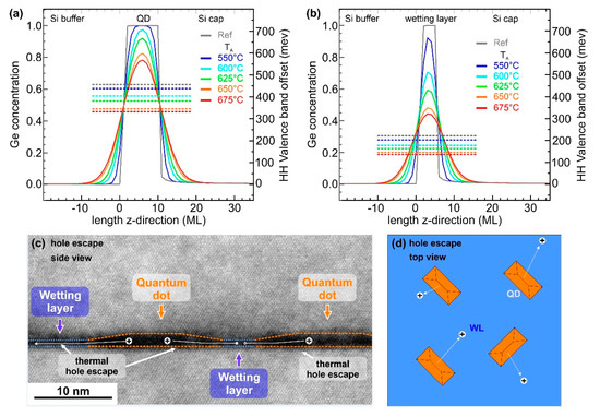 - Groiss, H.; Spindlberger, L.; Oberhumer, P.; Schäffler, F.; Fromherz, T.; Grydlik, M.; Brehm, M. Photoluminescence enhancement through vertical stacking of defect-engineered Ge on Si quantum dots. Semicond. Sci. Technol. 2017, 32, 02LT01. [Google Scholar] [CrossRef]