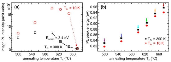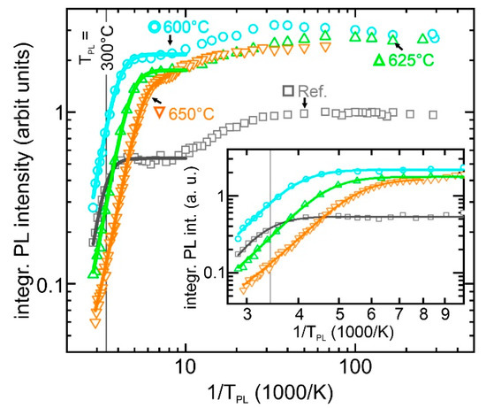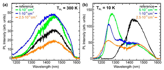- Spindlberger, L.; Prucnal, S.; Aberl, J.; Brehm, M. Thermal stability of defect-enhanced Ge on Si quantum dot luminescence upon millisecond flash lamp annealing. Phys. Status Solidi A 2019, 216, 1900307. [Google Scholar] [CrossRef]