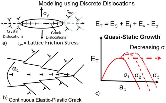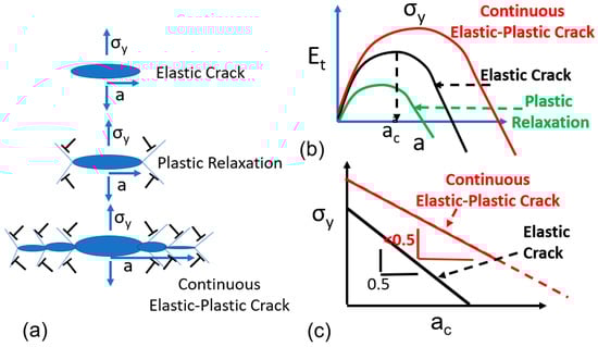 In Figure 1a, Griffith’s elastic crack [1] is described. The total energy of the system involves the change in the elastic energy due to the presence of a crack under applied stress σy, work done by the applied stress, and work expended in creating two new surfaces. The total energy reaches a peak, where crack length longer than the critical size ac will expand continuously with the reduction in the total energy, Figure 1b. The energy gradient provides the crack-tip driving force. If the energy to nucleate crystal dislocations from the crack tip is lower than the energy needed for the crack to expand further as an elastic crack, then the crack undergoes plastic relaxation, causing a reduction in the total energy of the system.