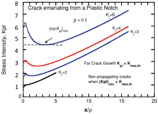 Figure 3b also shows the crack initiation ahead of the notch tip. This can occur at grain boundary junctions (accentuated by the presence of carbide particles or inclusions) due to high hydrostatic stresses present. Several models have been developed assuming such nucleation [24,25,26]. We show later a similar problem was analyzed using discrete dislocations where short crack nucleation ahead of a blunt crack is considered. Figure 4 shows typical results of short crack initiation and growth near notches with different Kt values but for a fixed ρ, showing how minimums in Ksc values become sharper with increasing Kt value.