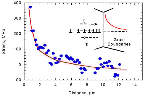 Since stress concentrations are essential for the initiation of cracks in the material, if there are no pre-existing cracks or stress concentrations, then the inhomogeneous deformations produce localized stress concentrations via the formation of dislocation pile-ups, as discussed by several authors, beginning with Eshelby [27]. The typical internal stress profile ahead of a dislocation pile-up deduced by Eshelby is shown in Figure 5, which was experimentally confirmed by X-ray analysis by Gao et al. [28]. The internal stress profile is not much different from that of a notch tip stress field. In fact, it was shown that most of the stress fields at stress concentrations follow a similar pattern [29]. The implication is that incipient cracks that form at stress concentrations will also have typical profiles for their stress intensity factor, as shown in Figure 3 and Figure 4, with minima that must exceed the governing threshold for continuous crack growth. Otherwise, initiated growing short cracks are arrested. Experimentally, one finds many short cracks are initiated near the surface under, for example, corrosion, but only one or two grow and thus contribute to specimen failure.