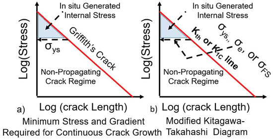 Figure 6b shows a similar behavior that can be extracted using the modified Kitagawa–Takahashi diagram, which was initially developed for fatigue failure. The crack-growth threshold stress-intensity factor replaces Griffith’s criterion, and the endurance limit replaces the yield stress. Our modification involves extending the threshold line beyond the endurance limit, thereby defining the internal stress triangle. At the endurance of a smooth specimen, close to 107 cycles are needed for the crack to initiate and grow. These cycles are required for the development of the needed internal stresses and their gradients for an incipient crack to form and grow. The initiation and growth of the short crack in the endurance have been accounted for by the fracture mechanics community by invoking the similitude break down and proposing that the short crack threshold is different from that of long crack thresholds due to crack closure. We have shown using the dislocation theory that the crack-closure concept is inherently faulty in the plane strain regim e, and no similitude break down is needed to account for the short crack growth behavior. The short crack grows due to the presence of both applied and in situ generated internal stresses arising from inhomogeneous deformations in the polycrystalline materials. The thresholds do not depend on the crack size, and one has to properly account for the local build-up of internal stresses and their gradients due to dislocation pile-ups. A detailed review of short crack growth was provided recently [30].