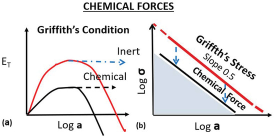 Figure 7 provides a simple case where chemical forces manifest in terms of reduction in the surface energy of the crack surfaces, thereby reducing the required applied stress needed for a Griffith crack, for example, to be initiated and grow (Equation (2)). The total energy as a function of the crack length is reduced (Figure 7a), and, correspondingly, the applied stress needed for a given crack length is reduced (Figure 7b). The micromechanisms involved in the reduction of crack tip driving force can be complex. Nonetheless, the net result from the point of engineering considerations is that there is a reduction in the required applied stress to contribute to the same crack length or crack growth rate. Hence, we can formally define the mechanical equivalent of chemical forces based on the reduction in the required stress to cause the same crack growth rate. This is shown in Figure 7b. To compute the chemical stresses involved, we need, therefore, crack growth in the inert medium as a reference state. For corrosion fatigue, fatigue in an inert medium can be used as a reference state. However, care should be exercised since fatigue is a two-load parametric problem requiring σmax and Δσ for Stress vs. number of cycles for failure (S-N fatigue) fatigue or two stress intensity factors (Kmax, ΔK) for fatigue crack growth [30]. However, for stress corrosion or sustained load crack growth, there is no subcritical crack growth in an inert environment for a reference state. Only the fracture toughness value in an inert medium provides the reference.