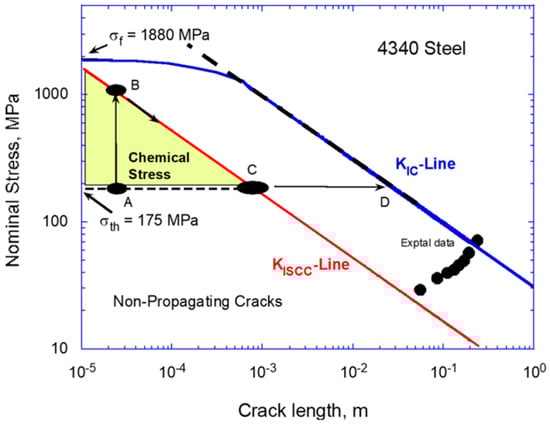 Modified Kitagawa–Takahashi diagram for stress corrosion crack growth in 4340 steel in H2SO4 solution, extracted from Hiroshi–Mura data.