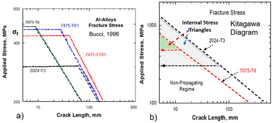 The above concepts are relevant not only for subcritical crack growth, but also to fracture toughness (Figure 10). Experimental data from Bucci (1996; [33]) are shown in Figure 10a, and the data are plotted in terms of the modified Kitagawa–Takahashi diagram for two selected alloys (Figure 10b), one with low and the other with high fracture stresses. The horizontal portions of the plot correspond to the tensile fracture stress, while the inclined lines represent the K1C lines. The extension of the K1C lines defines the internal stresses needed to initiate a crack in a smooth specimen. The internal stress triangle is large for the low yield stress 2024-T3 alloy in comparison to the high yield stress 7075-T6 alloy, as expected.