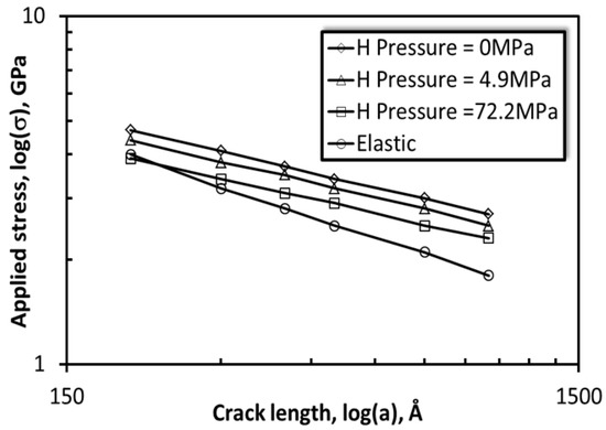 The effect of hydrogen on the embrittlement of steels has received significant attention [34]. Recently, Adlakha and Solanki [35] analyzed this problem extensively using both atomic simulations and continuum-based models. They show that hydrogen segregation around the crack tip enhanced both dislocation emission and cleavage behavior. Figure 13 shows the discrete dislocation analysis of elastic-plastic cracks in the presence of hydrogen [14]. The results indicate that for a given μ, the ratio of lattice friction to applied stress, the slope of log(stress) vs. log(crack length) increases as the hydrogen pressure increases, due to the increased cleavage component, and the curve moves closer to the Griffith crack.