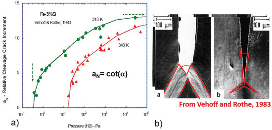 Experimental results from Vehoff and Roth, 1983, on Fe-3%Si showing the effect of hydrogen pressure on crack growth. (a) With the increase in the hydrogen pressure cot(α) increases (α decreases) due to the increase in the cleavage component. (b) The associated micrograph indicates the crack mouth angle decreases when hydrogen pressure increases.