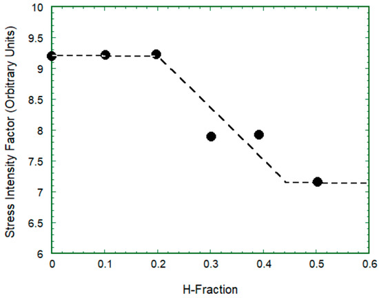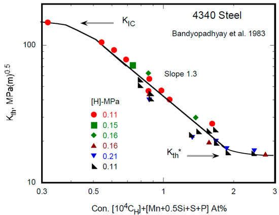 Experimental support for the analysis is provided in Figure 14, which is taken from Vehoff and Rothe [36], and shows that the cleavage component increases with increasing H-pressure, thereby reducing the crack mouth angle, α. Attached micrography shows the reduction in the crack mouth angle with increasing H-pressure. Further analysis (Figure 15) shows that the hydrogen effect saturates at high pressures. Thus, we have a negligible effect at shallow pressures and a saturation effect at high pressures. In the intermediate range, the presence of hydrogen reduces the mechanical driving force for crack growth, making the material more brittle. Experimental data are shown in Figure 16, taken from ref. [37], on the hydrogen embrittlement in alloy steels, which supports the above results.