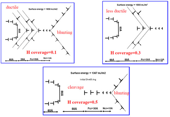 Discrete dislocation models of growth of an incipient crack from ahead of the main crack for various hydrogen coverages.