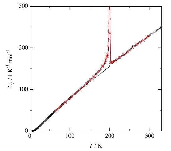 The sample with a mass of 2.74474 g (15.2354 mmol) after buoyancy correction was loaded in a gold-plated calorimeter vessel. The vessel was sealed after introducing a small amount of helium gas ( Pa at room temperature), which served as the heat conduction gas inside the vessel. The thermal equilibrium inside the vessel was attained within a reasonable time (1∼25 min depending on the temperature), except for the glass transition region. The sample contributed to the total heat capacity consisting of those of the sample, vessel, and the heat conduction gas by 25% at 100 K, 29% at 200 K, and 34% at 300 K. The working thermometer was the platinum resistance thermometer (MINCO, S1059), the temperature scale of which was based on the ITS-90 (International Temperature Scale of 1990 [16]).