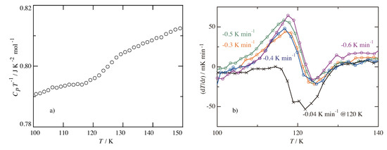 Another difference in the calorimetric results from the existing report [7] was a symptom of a glass transition around 120 K. Figure 4a shows the experimental heat capacities divided by temperature, obtained in the run from the lowest temperature. A definite step existed. In this temperature region, the temperature drift, which was the time course of temperature reading during the equilibration period after each heat input, showed the following behavior: exothermic at the low temperature side, while endothermic at the high temperature side. Besides, the strength of the exothermic and endothermic effects depended on the cooling rate. Sufficiently slow cooling nullified the exothermic effect. All of these behaviors could be rationalized by assuming the occurrence of enthalpy relaxation and is characteristic of glass transitions [23].