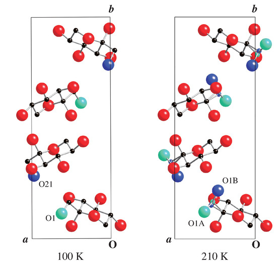 Crystal structures of the low (at 100 K) and high temperature (at 210 K) phases of d-sorbose viewed along the c-axis. Green and blue balls on the right are the major and minor components of the disordered oxygen atom in the high temperature phase. Hydrogen atoms are not shown for clarity.