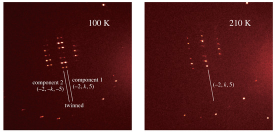 Although no symptom was encountered for phase transitions around 260 K, we detected a definite change caused by the main transition at 199.5 K. Diffraction photographs taken above and below the transition temperature are compared in Figure 7. The splitting of an array of diffraction spots is evident. We could index the obtained diffractions reasonably by assuming the twinning of monoclinic crystals while keeping the orientations of the and axes. The resultant indexing indicated that two domains had the opposing -axis.
