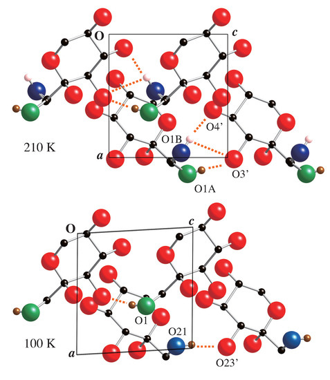 Since the phase transition kept the essential molecular packing, the molecular network formed by hydrogen bonds (H-bonds) between molecules remained mostly the same. We here describe only the notable changes involving the disordering oxygen atoms. Such H-bonds existed between equivalent molecules related by the translation. Figure 8 shows the relevant H-bonds. In this paragraph, the prime () indicates the atoms of the translated molecule defined locally. The bond between O1A and O3 via H1A in the high temperature phase (at 295 K) was nearly linear (∠OHO ) with a reasonable length (O-O Å) and kept its feature even in the low temperature phase (at 100 K) as that between O1 and O3 ( and 2.75 Å). On the other hand, the distances between H1B (bonding to O1B) and O3 (H-B Å) and O4 (H-B Å) in the high temperature phase implied the possible formations of H-bonds. The geometry was more reasonable in the bond to O4 (∠OHO ) than O3 (∠OHO ). Indeed, H1B was apparently out of the shortest connection between O1B and O3. However, the phase transition established a linear H-bond with a reasonable length between O21 and O23’ via H21 ( and 2.77 Å).