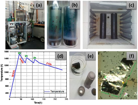 The tools used for the crystal growth process. (a) The argon arc machine used for wielding the niobium ampoule. (b) The quartz tube containing the sample sealed under vacuum. (c) The box furnace with a stainless-steel shield containing the sample. (d) The temperature profile for the crystal growth with multistep crystallization. (e) The removal of the flux using distilled water. (f) An optical image of one of the produced crystals (800 × 350 µm2).