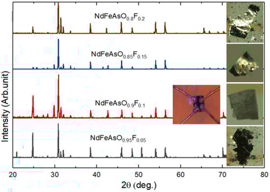 Powder XRD patterns for NdFeAsO1-xFx with different fluorine doping, together with a piece of crystal sample of each grown system. The inset is an image of a crystal with four probes connected on the surface for transport measurements.