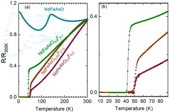 The transport measurements: (a) Illustrates the temperature dependence of the in-plane resistance measurements upon the heating of the NdFeAsO1 − xFx single crystals at x = 0, 0.1, 0.15, and 0.2. (b) The close-up of the low-temperature region, highlighting the superconducting transition.