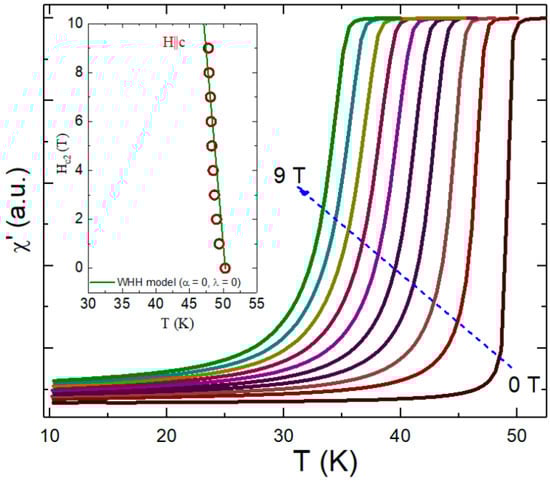 Figure 4 represents the temperature dependence of the complex ac-susceptibility components of NdFeAsO0.8F0.2. The measurement was done in 5 Oe ac field amplitude and 1 kHz field frequency. The data were collected upon warming in the different dc magnetic fields after cooling in a zero magnetic field. The inset in Figure 4 presents the magnetic phase diagram of the temperature dependence of the upper critical field of NdFeAsO0.8F0.2. The data were fitted according to the Werthamer–Helfand–Hohenberg (WHH) theory (solid line) []. The WHH theory predicts the behavior of Hc2(Tc) by considering paramagnetic and orbital pair breaking. The investigated sample indicated a very high upper critical field, Hc2. Using a fit to the data in the whole measurement range for negligible spin-paramagnetic effects (α = 0) and spin-orbit scattering (λ = 0) yielded μ0Hc2 = 95 T for x = 0.2. [].