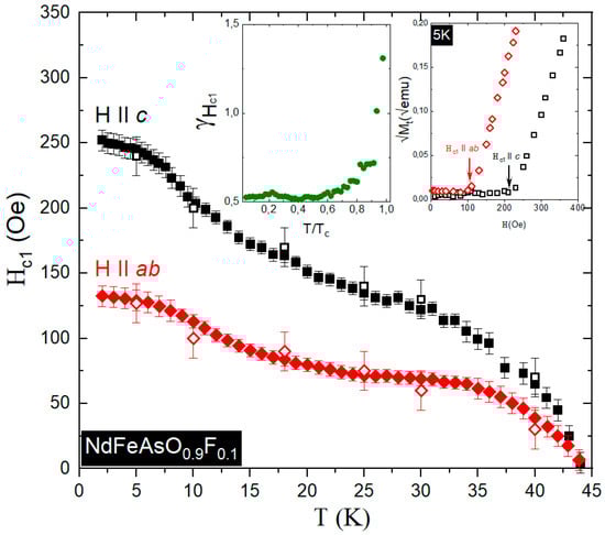The extracted lower critical field, Hc1, of NdFeAsO0.9F0.1 as a function of temperature. The data were collected for both orientations for H || ab and H || c. The bars show the uncertainty of estimation by the deviating point of the M-H []. The inset shows the temperature dependence of the anisotropy of Hc1: γHc1 = Hc1||c/Hc1||ab.