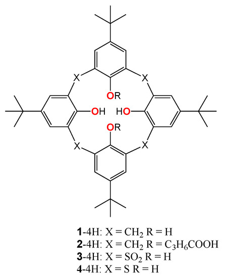 Classical p-tert-butylcalix[4]arene (1-4H), the targeted macrocyclic ligand (2-4H), Tetrasulfonylcalix[4]arene (3-4H) and thiacalix[4]arene (4-4H).