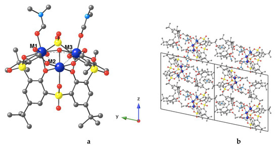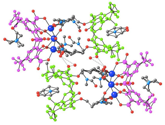 It is important to note that the metallic triangles, resulting from the association of two short and one long M-M bonds, are maintained by a μ3-O atom from a coordinated water molecule and are reproducibly obtained. This triangular feature has already been observed in the literature [45]. The observation of triangles with paramagnetic metallic ions is well documented [46,47], leading to high spin molecules presenting either ferromagnetic or antiferromagnetic interactions, depending on the geometric parameters.