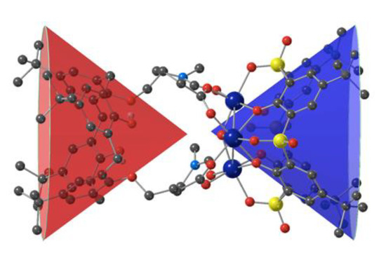 The complex displays a “non-tubular” feature, where the fusion of both cone cavities is ensured by the trinuclear species, as shown in Figure 2b, which blocks the pathway from one cavity to another.
