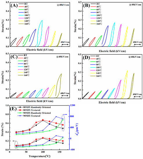 - Hao, J.; Ye, C.; Shen, B.; Zhai, J. Enhanced electrostricitive properties and thermal endurance of textured (Bi0.5Na0.5)TiO3-BaTiO3-(K0.5Na0.5)NbO3 ceramics. J. Appl. Phys. 2013, 114, 054101. [Google Scholar] [CrossRef]