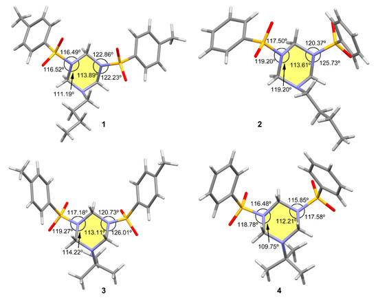 According to the single crystal X-ray diffraction data, molecules 1–4 comprise the 1,3,5-triazacyclohexane ring bearing three substituents at the nitrogen atoms (see Figure 1).
