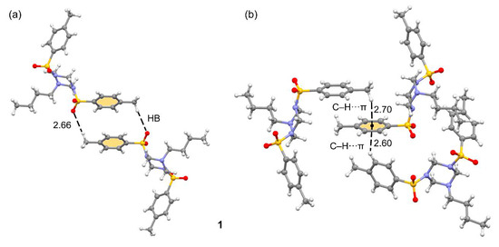 (a) Self assembled dimer in compound 1. (b) C–H···π···H–C assembly in the solid state of structure 1. Distances in Å. For the C–H···π interactions, the distances are measured from the H-atom to the ring centroid.