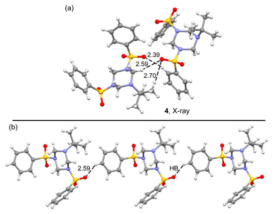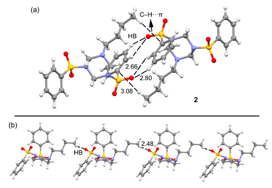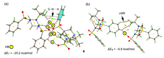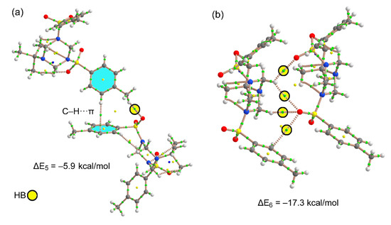 Figure 11 shows two dimers of compound 3, one corresponds to the C–H···π assembly commented above in Figure 4, where in addition to the C–H···π interaction (characterized by a bond CP and bond path) the assembly is further characterized by a C–H···O bond involving the methyl group. This assembly presents a modest interaction energy of ΔE4 = −5.9 kcal/mol. In contrast, the dimer shown in Figure 11b, extracted from the infinite 1D assembly, exhibits a strong interaction energy (ΔE5 = −17.3 kcal/mol) due to the formation of four C–H···O contacts, which are characterized by a bond CP and bond path (see yellow circles in Figure 11b). The strong interaction energy agrees well with the MEP surface analysis commented above, since the H-bond donors belong to the triazinane ring that exhibit the most positive MEP values. Moreover, the H-bond acceptors are the O-atoms of the sulfonamide groups that present the most negative MEP values (see Figure 8).